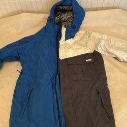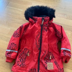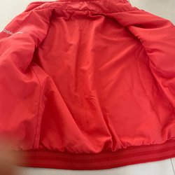 Röd jacka med huva och dragkedja framtill. Jackan har två fickor med dragkedja.