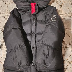 En orange dunjacka med huva. Jackan är lite ojämn i dunet men annars i fint skick.