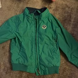 Mörkblå duffeljacka med huva och knäppning framtill. Jackan har två fickor fram.