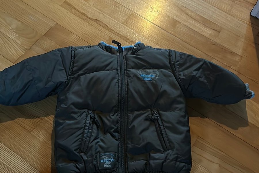 En mörkgrå Esprit-jacka med dragkedja framtill och två fickor med dragkedja. Jackan har en ribbad mudd i nederkant och vid ärmslut i blått och grått. På bröstet finns en broderad text "athletic team" i blått och nedtill på jackan finns en Esprit-logotyp med texten "esprit 1968".
