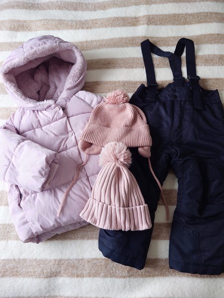Ett set med en rosa jacka, ett par svarta termobyxor med hängslen och två rosa mössor
