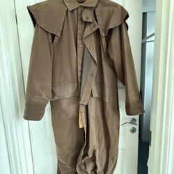 Jackan är i fint skick. Byxorna är mer använda. Bild finns på de skrap som finns på byxorna på knäna, på nedre byxbenet och på baksidan.