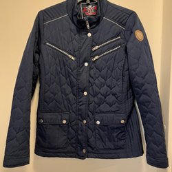 Marinblå vadderad jacka från Everest med dragkedja och fickor fram. Jackan har en huva.