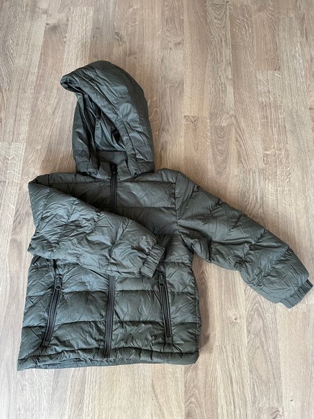 Tunn dunjacka/lättviktsjacka med huva och dragkedja framtill. Jackan har två fickor med dragkedja i sidorna. Ärmsluten är elastiska. Storlek 116 men har använts från strl 110 eftersom den är så mjuk och följsam. Passar bra att använda exempelvis till och från förskolan långt in på våren.