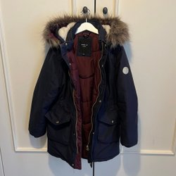 Svart jacka med dragsko i midjan, fickor fram och en luva med fuskpäls.