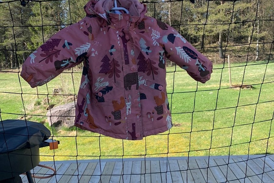 En rosa jacka med ett mönster av skogsdjur och träd. Jackan har en huva och knäppning framtill. På två av knapparna är färgen lite bortskavd.