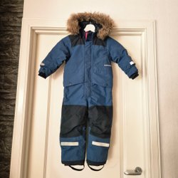 Lila Didriksons 1913 overall med avtagbar huva. Välanvänd men fortfarande i bra begagnat skick. Det största slitaget finns vid bensluten, fothällorna är lite uttöjda och tyget runt dem har släppt i sömmen. Det förekommer några små hål i innerfodret, en gammal lagning invändigt samt en söm som har släppt mellan innerfoder och resårband i benslut, se bilder. Hängaren vid nacken är trasig. Småfel som lätt kan fixas! Namnad. I övrigt hel och fungerar som den ska. Stor i storlek. Har även extendfunktion i ärmarna som vi inte utnyttjat.