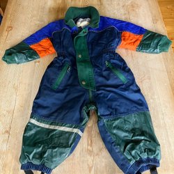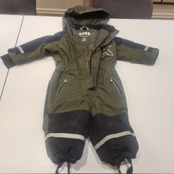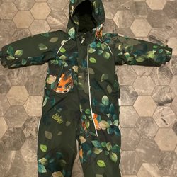 Grön overall med huva. Overallen har dragkedja och knappar framtill, samt två fickor med dragkedja. Reflexer finns på ärmar och ben. Reflexer lite slitna. Resårerna nedtill är trasiga, går att ta bort. Bamse by Lindex.