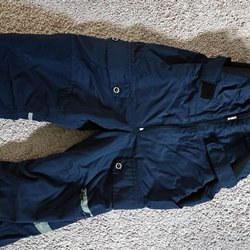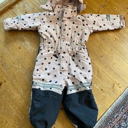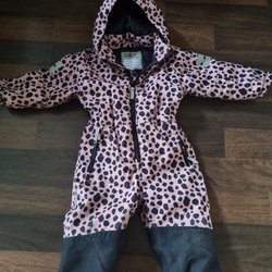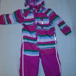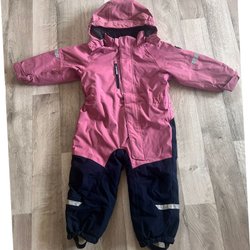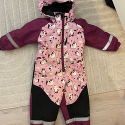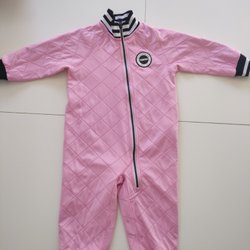 Rosa och svart overall med huva och dragkedja framtill. Den har resår i midjan och reflexer på ärmar och ben. Mycket fint skick.