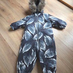 En söt overall med ett mönster av rävar och växter. Den har en huva med fuskpäls och en dragkedja framtill. Overallen har resår i midjan och vid anklarna.