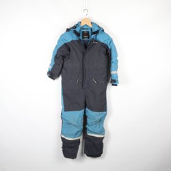 Blå overall med grå förstärkningar på knän och rumpa. Overallen har en avtagbar huva med fuskpäls och flera fickor framtill. En laglapp på ena knäet, i övrigt sliten på knän och rumpa men hel.