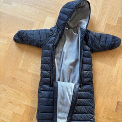Svart overall med avtagbar huva från Parvel. Overallen har dubbel dragkedja framtill och en liten ficka på bröstet. Mjukt fleecefoder inuti med blå, grå och svarta ränder. Nopprig på muddarna.