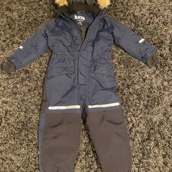 Blå vinteroverall med avtagbar huva med fuskpäls. Overallen har dragkedja framtill och två fickor med knappstängning. Det finns reflexer på ärmar och ben. Använd av 2 barn. Har en lagning bak på höger ben med avsedd lagringslapp. Är tvättad enligt anvisning och har absolut kvar att ge.