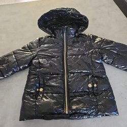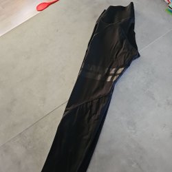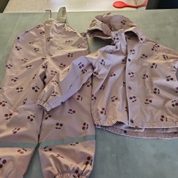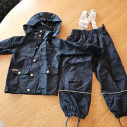 Grön overall med huva, två fickor fram och dragsko i midjan. Benen är förstärkta med ett svart tyg nedtill och har resårband vid bensluten. Ärmarna har resår och reflexer.