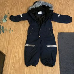 En fin vinteroverall från Polarn O. Pyret i blå och svart färg. Overallen har en avtagbar huva och reflexer på benen och ärmarna. Det finns en liten reva på ena benet, se sista bilden. Kan dock sys ihop eller lappas om man så önskar.