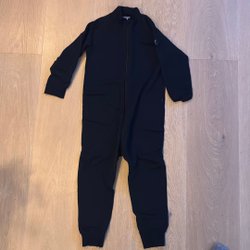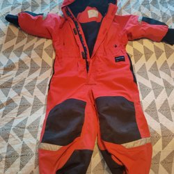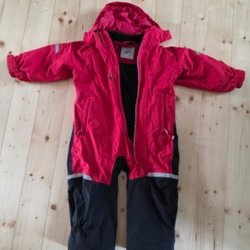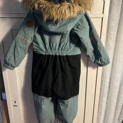 Skicket är begagnat men finns inga defekter, en varm och fin vinteroverall som har mycket kvar att ge! De slitna hällorna är borttagna. Samtliga fyra knappar finns kvar och nya hällor kan enkelt sättas fast!