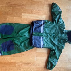 Mörkblå overall med avtagbar huva, dragkedja framtill och resår i midjan. Reflexdetaljer finns på ärmar och ben. Trasiga fotremmar.