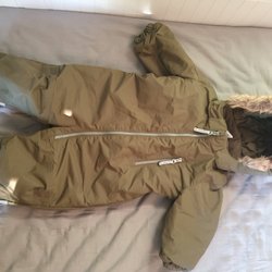 Grön overall med huva och reflexer på benen. Dragkedja framtill för enkel påklädning. Observera att det finns en reva på framsidan på höger ben. Kan behövas en laglapp.