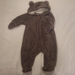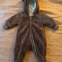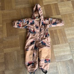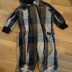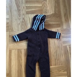 Brun overall med ett blommigt mönster i blått och rött. Den har en huva med blått foder och en dragkedja och knappar framtill.