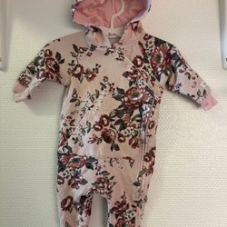 overall med luva, dragkedja och knappar. Den har en liten ficka framtill med stickat mönster. Fötterna och ärmarna kan vikas över.