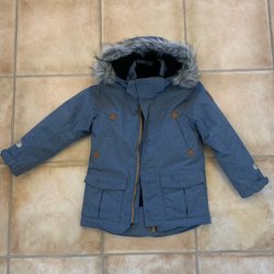 Vinteroverall från Name it, i mörkblå färg med dragkedja framtill och en huva med fuskpäls. Overallen har fickor med dragkedja på framsidan.