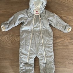 Vadderad overall i ljusgrå färg med ett mönster av vita stjärnor. Den har en huva och dragkedja framtill.