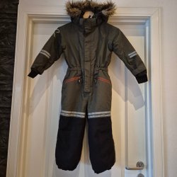 Didriksons vinteroverall i mörkblå färg med avtagbar fuskpäls på luvan. Strl 90 men extend size-stygnen öppnade så motsvarar ca 92/98.