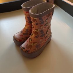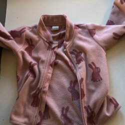 Rosa overall med huva och dragkedja framtill. Overallen har en bröstficka med dragkedja och muddar i ärmslut och benslut.