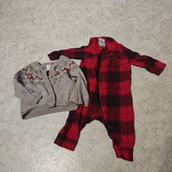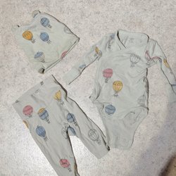 Ett set med en overall från Fred & Flo och en mössa. Overallen har ett mönster med fordon och en huva med fuskpäls. Mössan är grå med två tofsar och knytband.