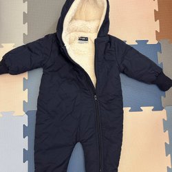 Blå overall med ett mönster av stjärnor och rymd. Den har en huva, dragkedja fram och mörkblå förstärkningar på ben och ärmar.
