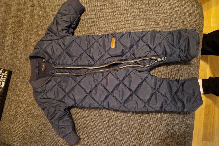 Marinblå vadderad overall med dragkedja framtill och en liten etikett på bröstet.