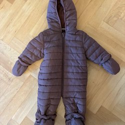 Brun overall med ett blommigt mönster i blått och rött. Den har en huva med blått foder och en dragkedja och knappar framtill.