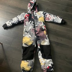 Blå overall med huva och fuskpäls. Overallen har två fickor med dragkedja framtill och en liten ficka upptill. Reflexband finns nedtill på benen.