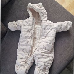 Mjuk och gosig overall med luva och öron. Den har knappar framtill och muddar vid ärm- och benslut.