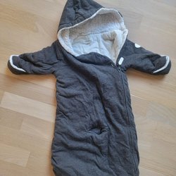 Grå mysig overall med luva och fötter. Overallen har dragkedja framtill och är fodrad med ett mjukt, fluffigt material.