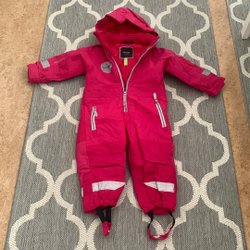 Röd overall med blå detaljer från Funk. Overallen har en avtagbar huva, dragkedja och tryckknappar framtill. Den har två fickor med tryckknappar på bröstet och två fickor med tryckknappar på benen. Reflexer finns på benen och ärmarna.