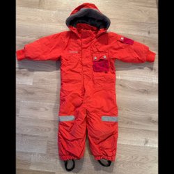 Röd overall med dragkedja och knappar framtill. Den har resår i ärmslut och benslut samt reflexdetaljer. 128 och 130 i storlek