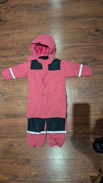 Rosa overall med svart fält på bröstet och benen. Reflexer finns på ärmarna och benen. Luvan är avtagbar.