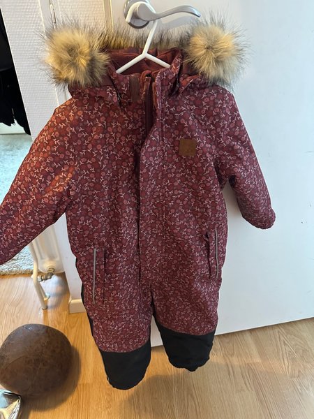 Vinteroverall med ett blommigt mönster och detaljer i svart nedtill. Overallen har en huva med fuskpäls.