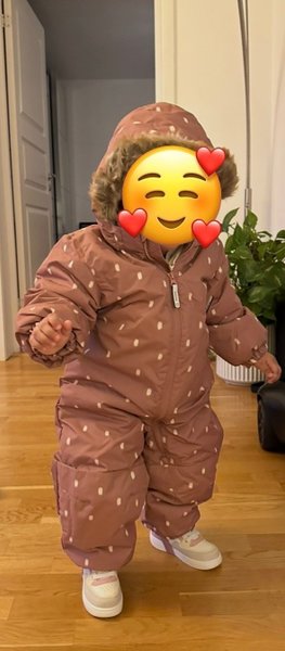 Vinteroverall i en rosa nyans med vita prickar och en huva med fuskpäls.