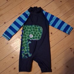 En jeansoverall med huva. Overallen har två dragkedjor som går från halsen ner till benen, vilket underlättar påklädning. Ärmslut och benslut har resår. Hel och ren, i mycket gott skick, bara lite tvättpåverkad och luddig (främst invändigt).