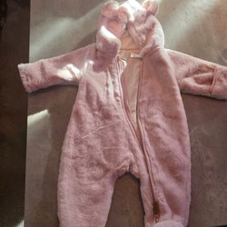 Overall med huva och dragkedja framtill. Huvan har små örondetaljer.