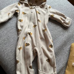 Söt och praktisk overall med ett mönster av små björnar. Overallen har en huva och en dragkedja framtill för enkel på- och avklädning. Perfekt för att hålla barnet varmt under kyligare dagar.