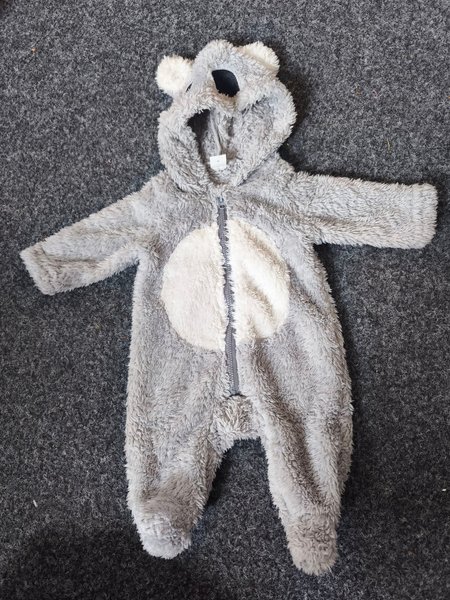 En mysig grå overall med huva och dragkedja framtill. Overallen har söta öron på huvan och en ljusare vit mage.