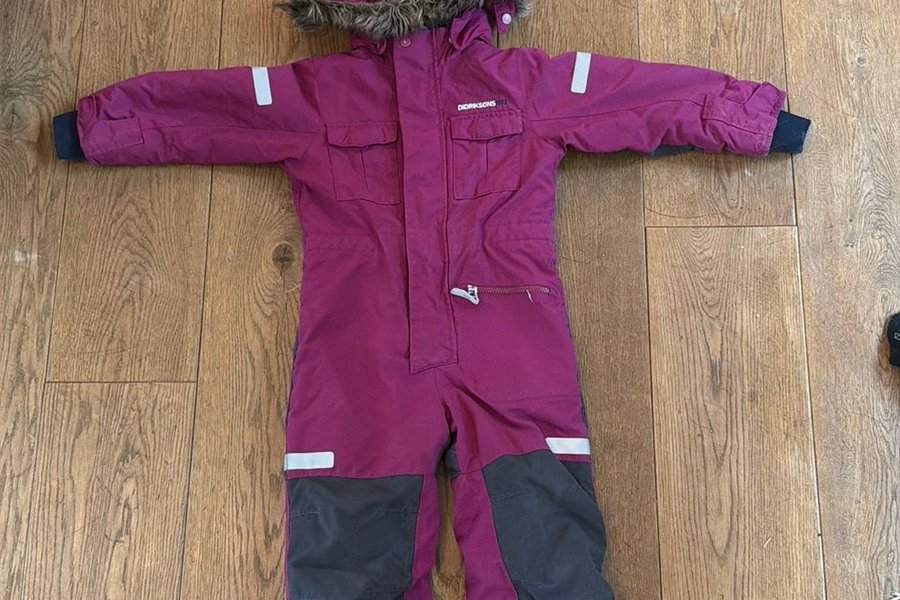 Overall med avtagbar huva med fuskpäls. Overallen har reflexdetaljer på ärmar och ben, samt förstärkta partier på knän och rumpa. Den har flera fickor, inklusive två bröstfickor med lock och en dragkedjeförsedd ficka på benet. Dragkedja framtill med skyddande slå.