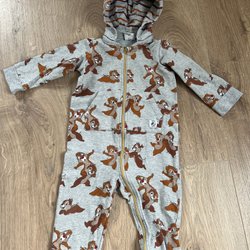 Grå vadderad overall med luva och tryckknappar framtill. Overallen har ett litet märke med ett björnansikte på bröstet och är fodrad med mjukt, vitt teddyfoder.