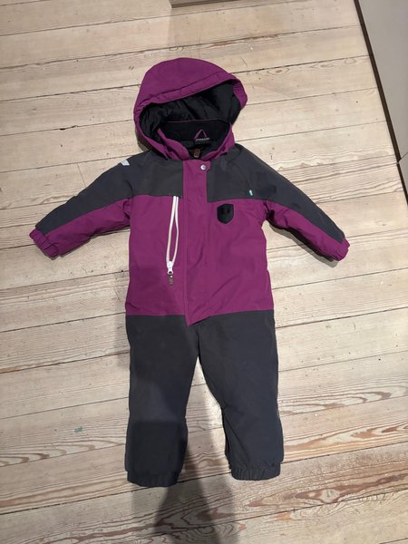 Lindberg Lila och grå overall med huva. Overallen har en dragkedja fram och en liten ficka på bröstet.