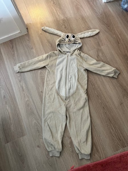En lekfull kanindräkt med huva och dragkedja framtill. Dräkten har långa ärmar och ben, perfekt för maskerad eller lek.
