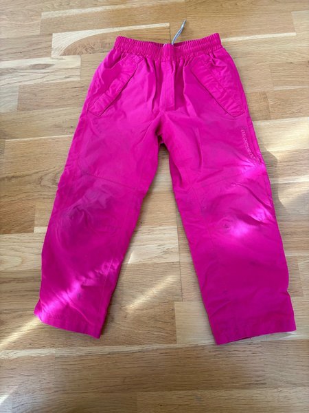 Ett par byxor i en stark rosa färg. Byxorna har resår i midjan och fickor framtill. Det finns förstärkningar på knäna och en liten logotyp på ena benet.