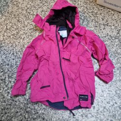 Vinröd skaljacka i strl 110. Dragkedjan är utbytt hos polarn och pyret. Annars är den i fint använt skick. Den är tidigare impregnerad med nikwax, men kommer inte tvättas inför försäljning. Men den är